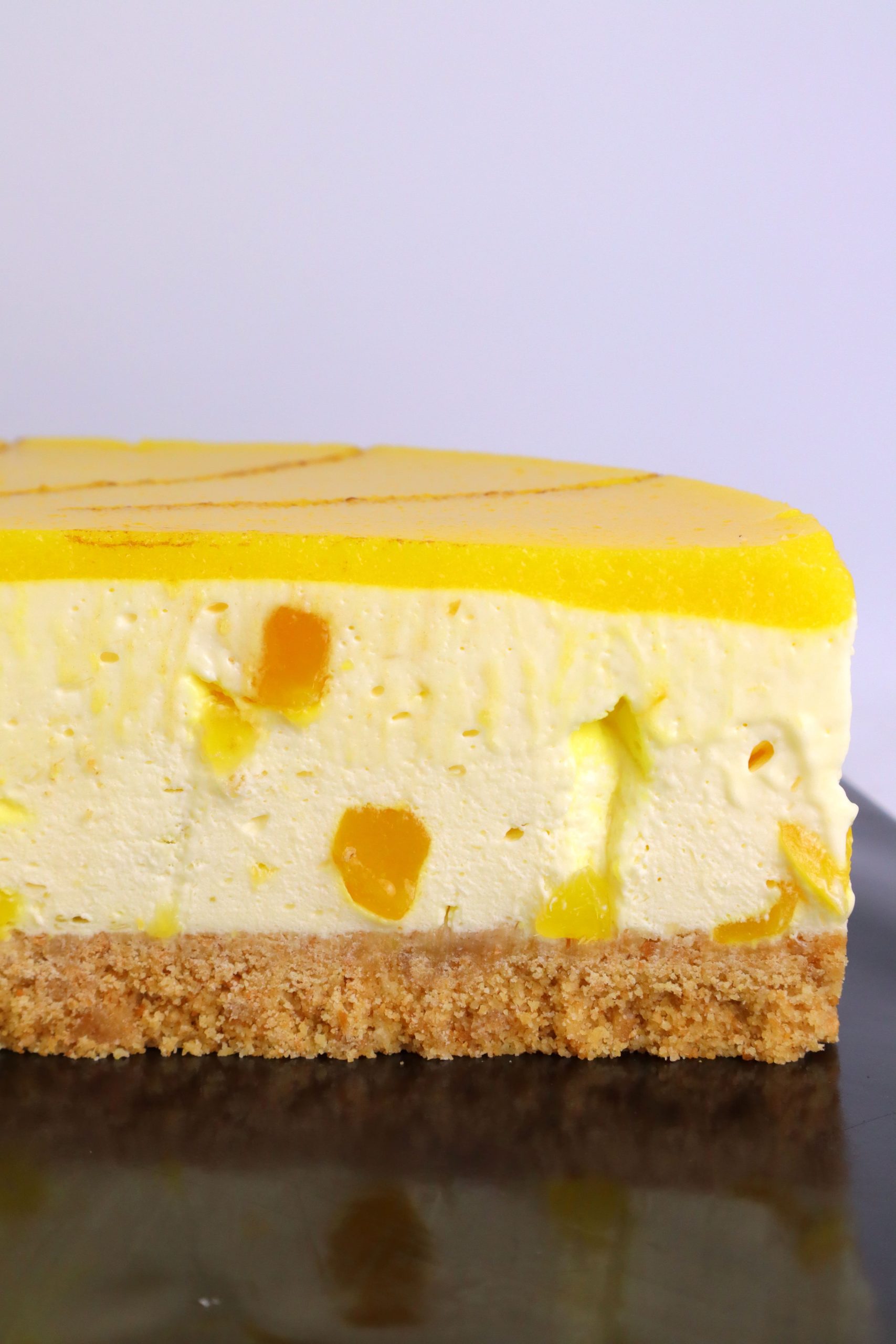 Buttery digestive biscuit base and filled with no-bake mango cheesecake.