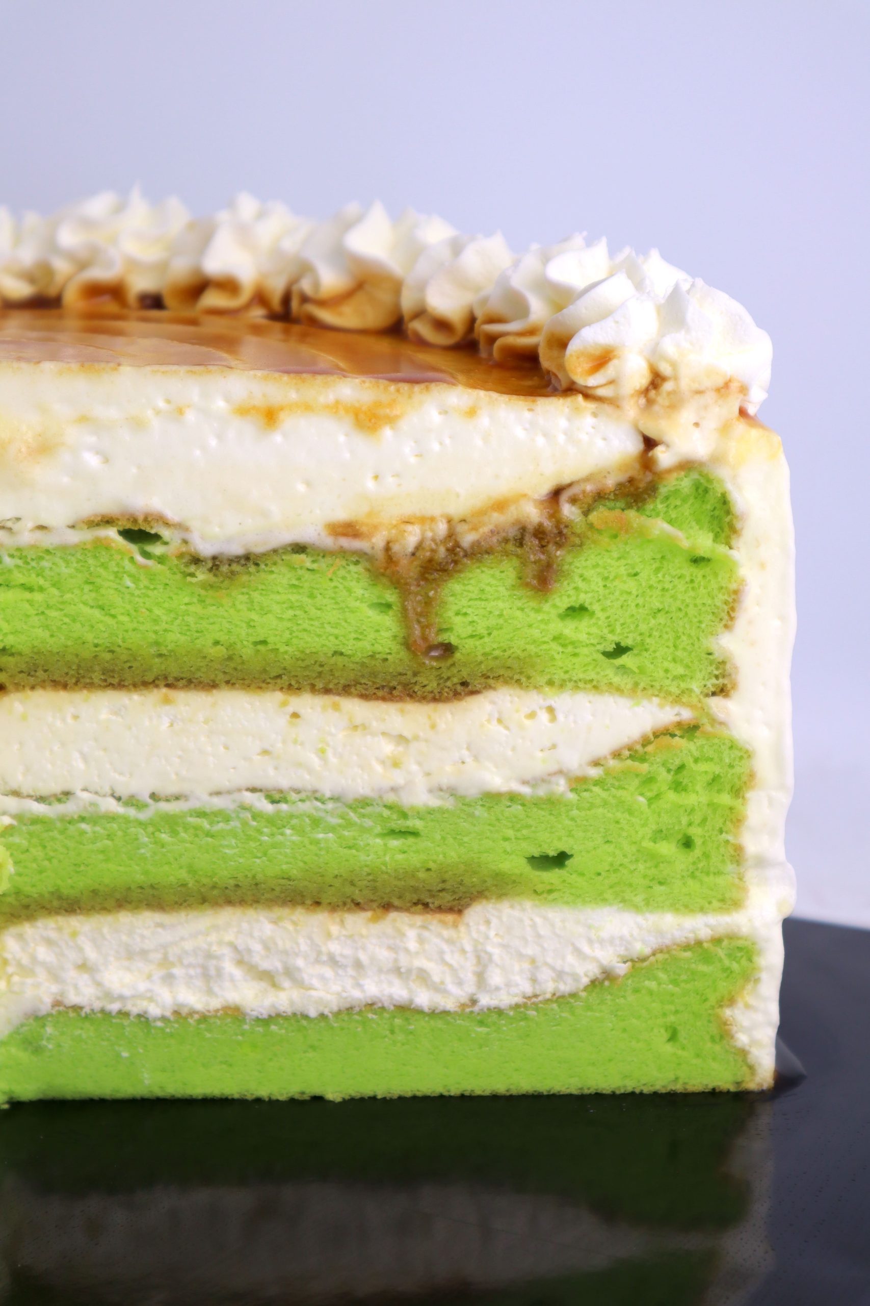 Three layers of pandan sponge cake. Iced and filled with whipped cream cheese and gula Melaka.