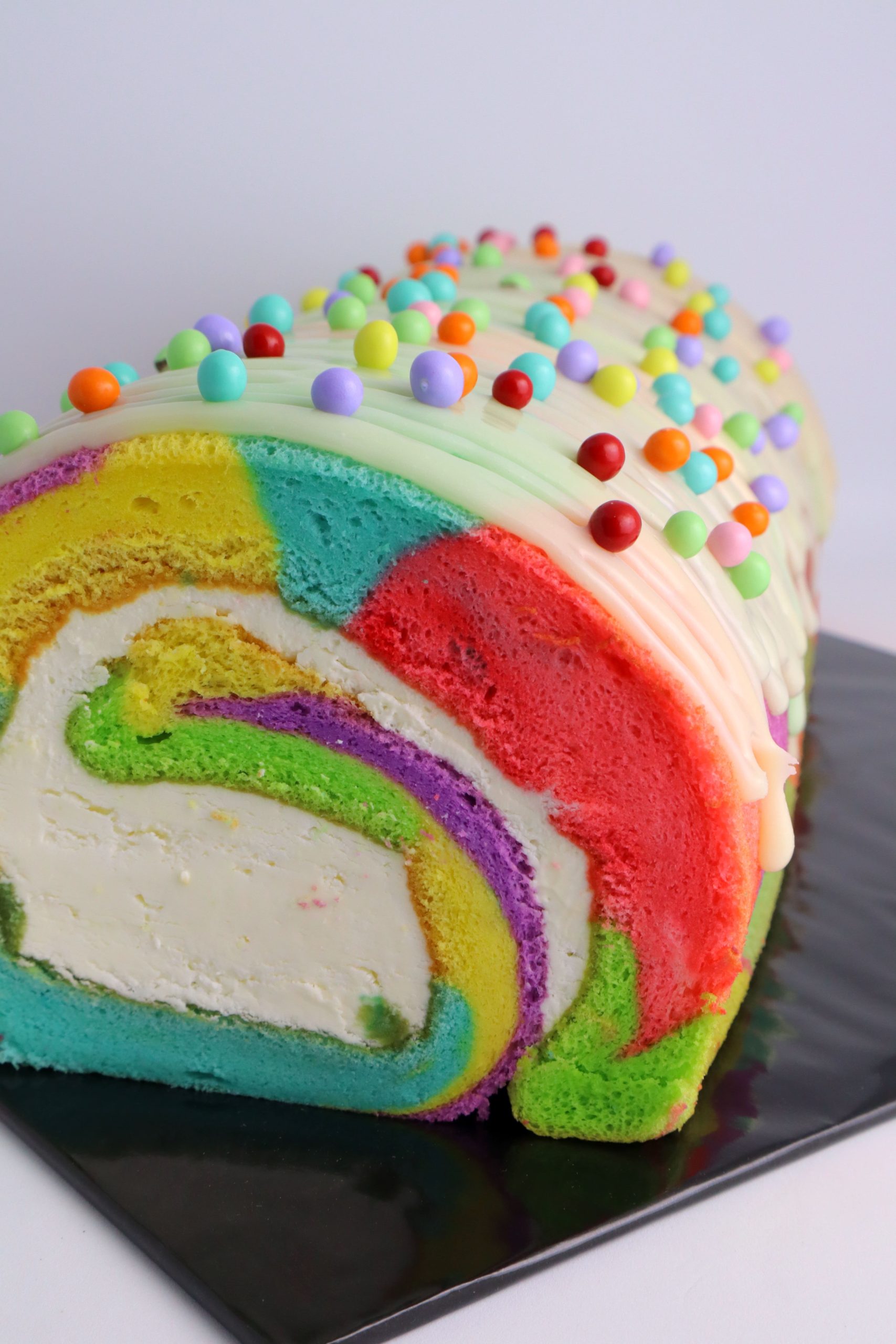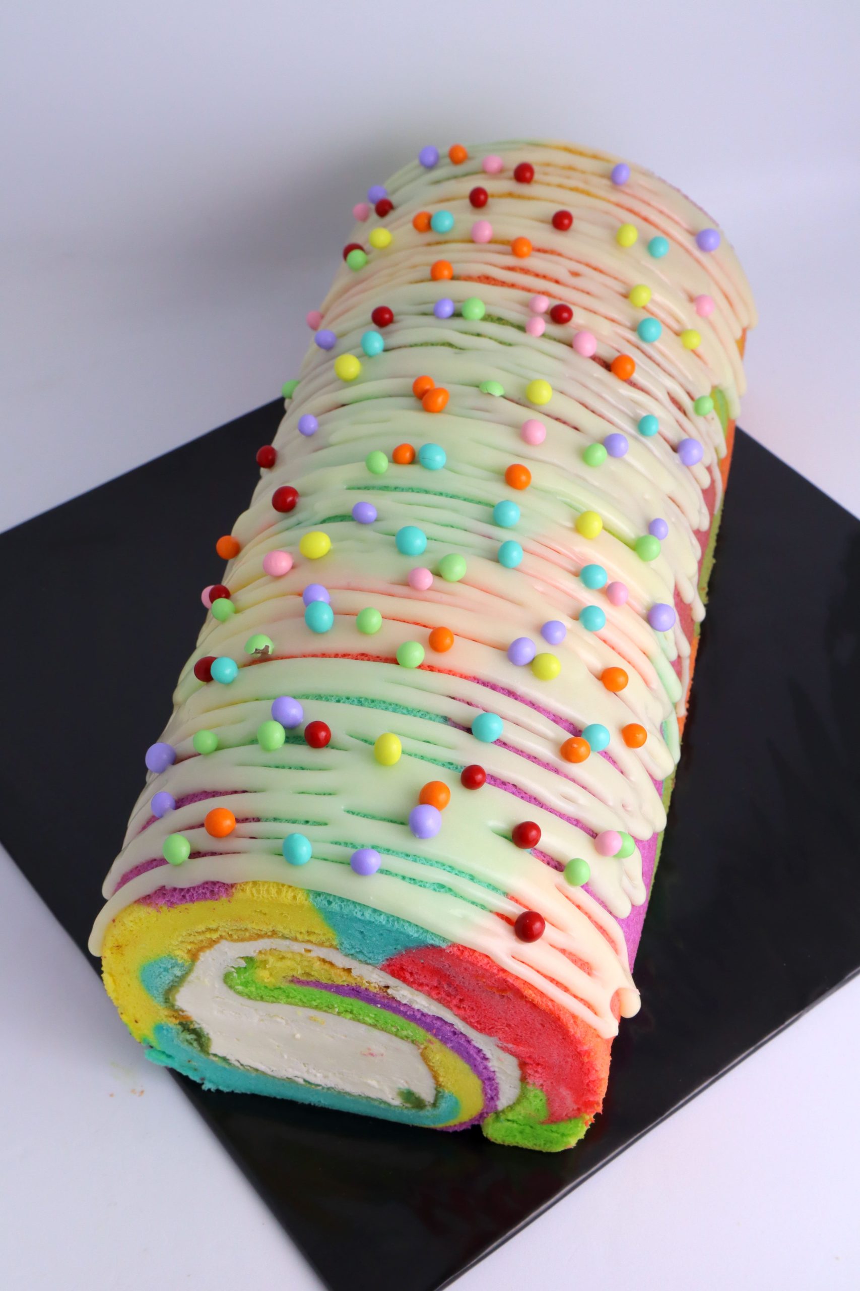 Rainbow colored swiss roll with whipped cream cheese. Decorated with white chocolate ganache and rainbow sprinkle.